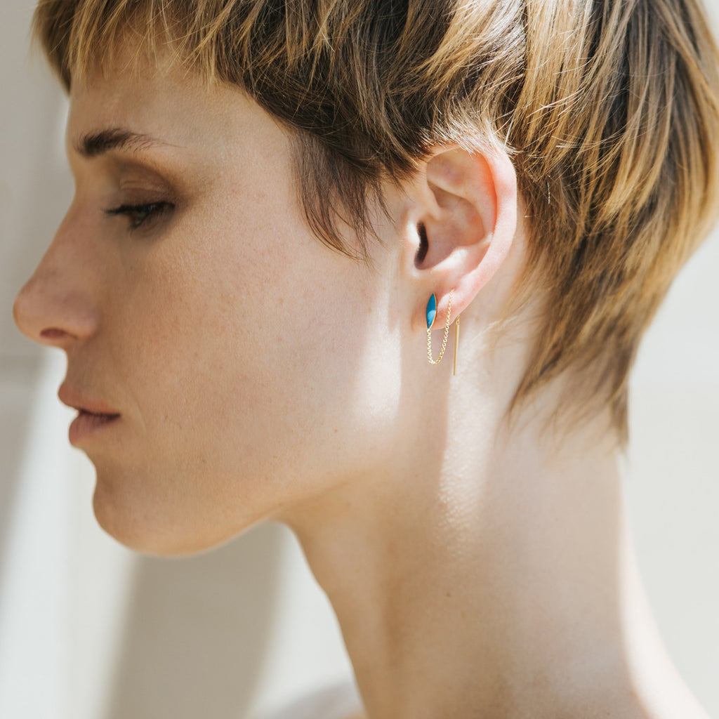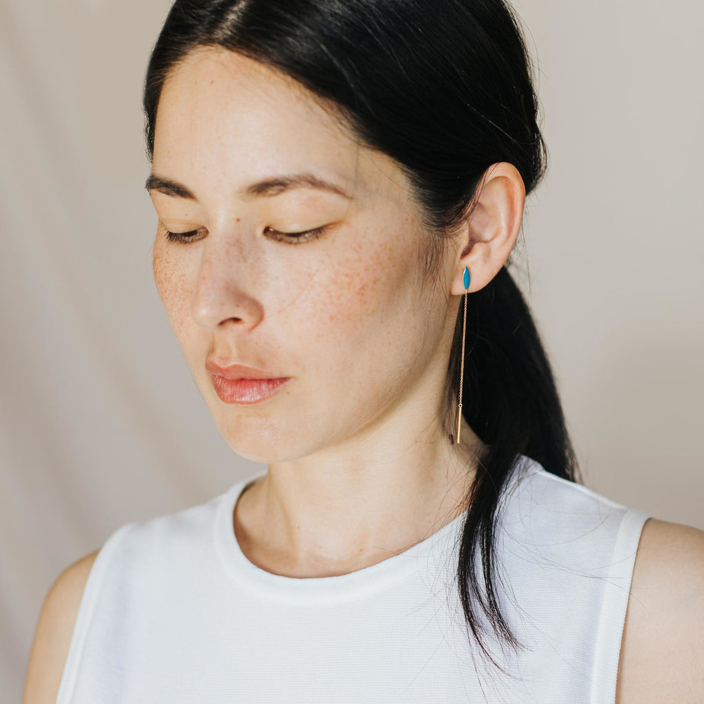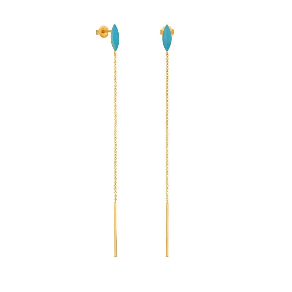 Lange øreringe i mat 24 karat forgyldt metal med en håndpåført turkis emaljedetalje, der tilføjer et strejf af farve til smykkerne.