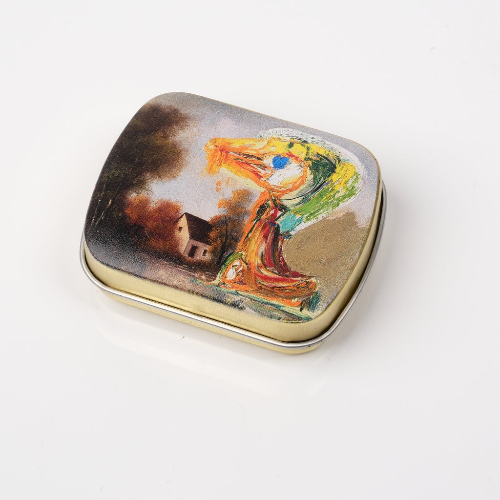 Mintæske med Asger Jorns modifikation Den foruroligende ælling fra 1959.